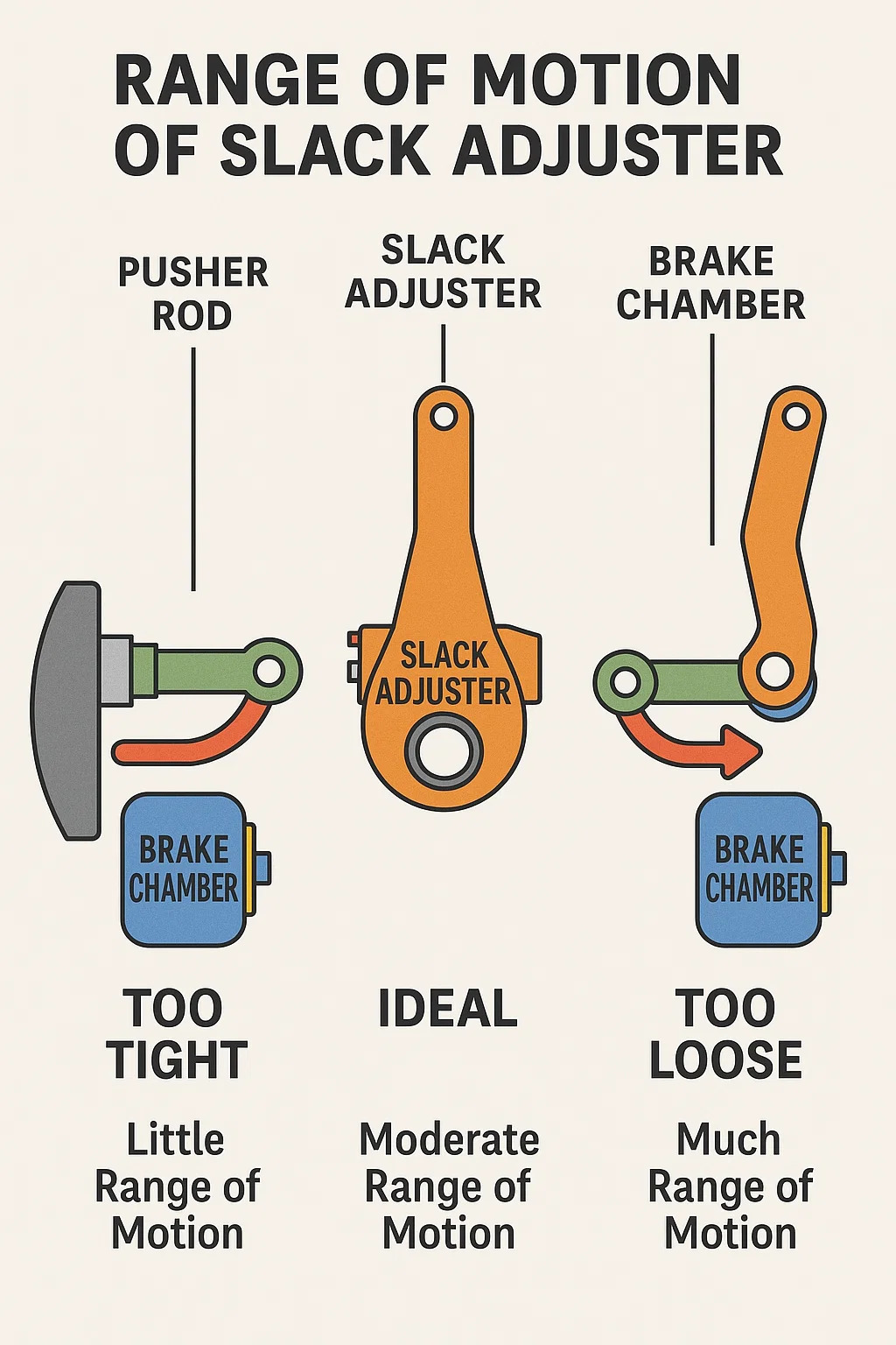 "محدوده حرکت" یا حرفه ای تر، ضربه ترمز، به فاصله ای که تنظیم کننده شل هنگام کشیدن میله فشار دهنده در هنگام فعال شدن سیستم ترمز بادی حرکت می کند، اشاره دارد.