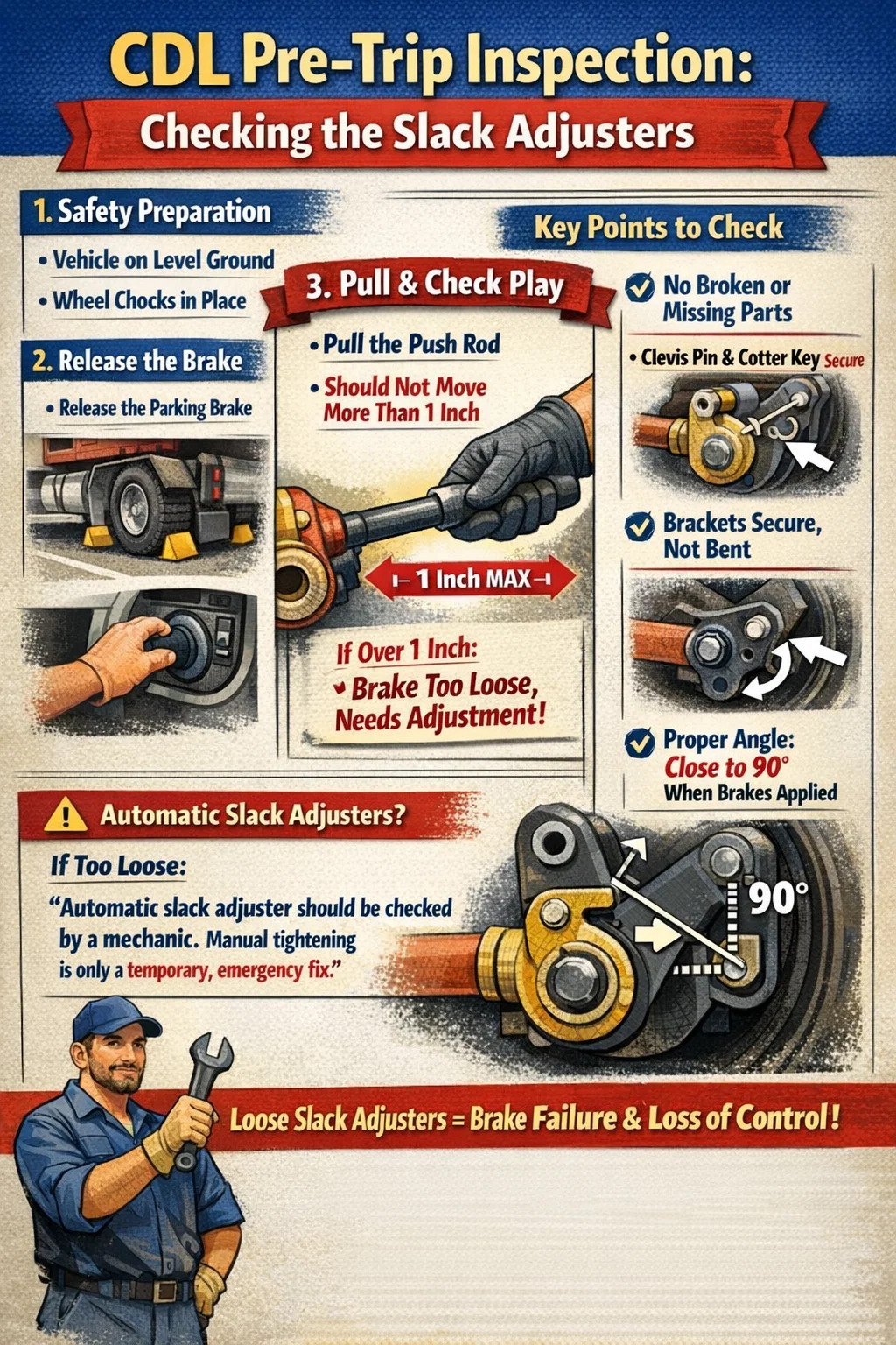 در فرآیند دریافت گواهینامه رانندگی تجاری (CDL)، بازرسی قبل از سفر یک بخش مهم است و بازرسی تنظیم کننده های شل یکی از مواردی است که ممتحنین بیشتر بر روی آن تمرکز می کنند.