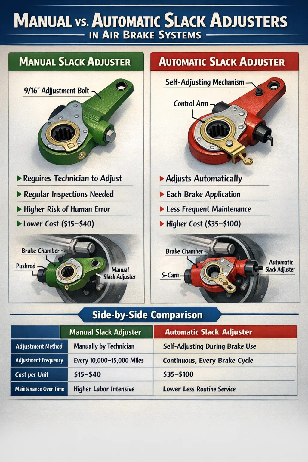 درک هر دو نوع مهم است که آیا شما یک مدیر ناوگان، یک راننده تجاری، یک تکنسین ترمز یا فردی که برای CDL تحصیل می کند، اهمیت دارد. مقررات فدرال تحت FMCSA 393.47 محدودیت های سختگیرانه ای را برای سفر با میله های فشاری تعیین می کند، و عدم بازرسی به دلیل ترمزهای تنظیم نشده می تواند یک وسیله نقلیه را بلافاصله زمین گیر کند. دانستن اینکه هر نوع تنظیم کننده شلی چگونه کار می کند - و چه مشکلی ممکن است در هر کدام از آنها رخ دهد - وسایل نقلیه را سازگار، ایمن و در جاده نگه می دارد.